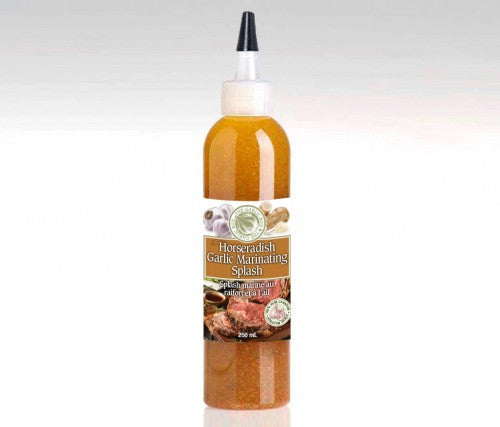 Tenderize and splash on the flavour with this garlicky, horseradish meat marinade! Ideal for roasts (beef, pork, lamb), chops, burgers or enrich an Au Jus, sauce or gravy. A BBQ friendly (zero flareups) no calorie, no carb splash that is a stand-alone seasoning for steaks, burgers and veggies.